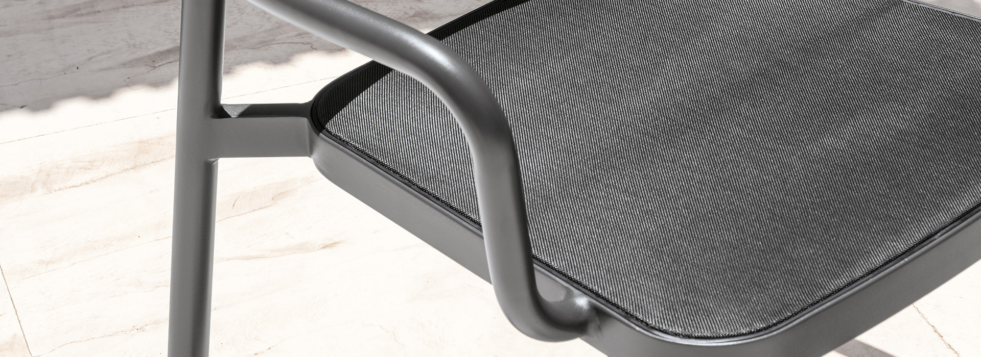 El Textilene es una fibra de poliéster protegida por un recubrimiento de PVC. Las fibras se unen entre sí para obtener un material fibroso particularmente sólido y duradero, resistente al estiramiento y a las roturas. Su característica más importante es su elasticidad; ofrece una excelente resistencia al moho y a las manchas, y cuenta con un tratamiento superficial contra la degradación por rayos UV.