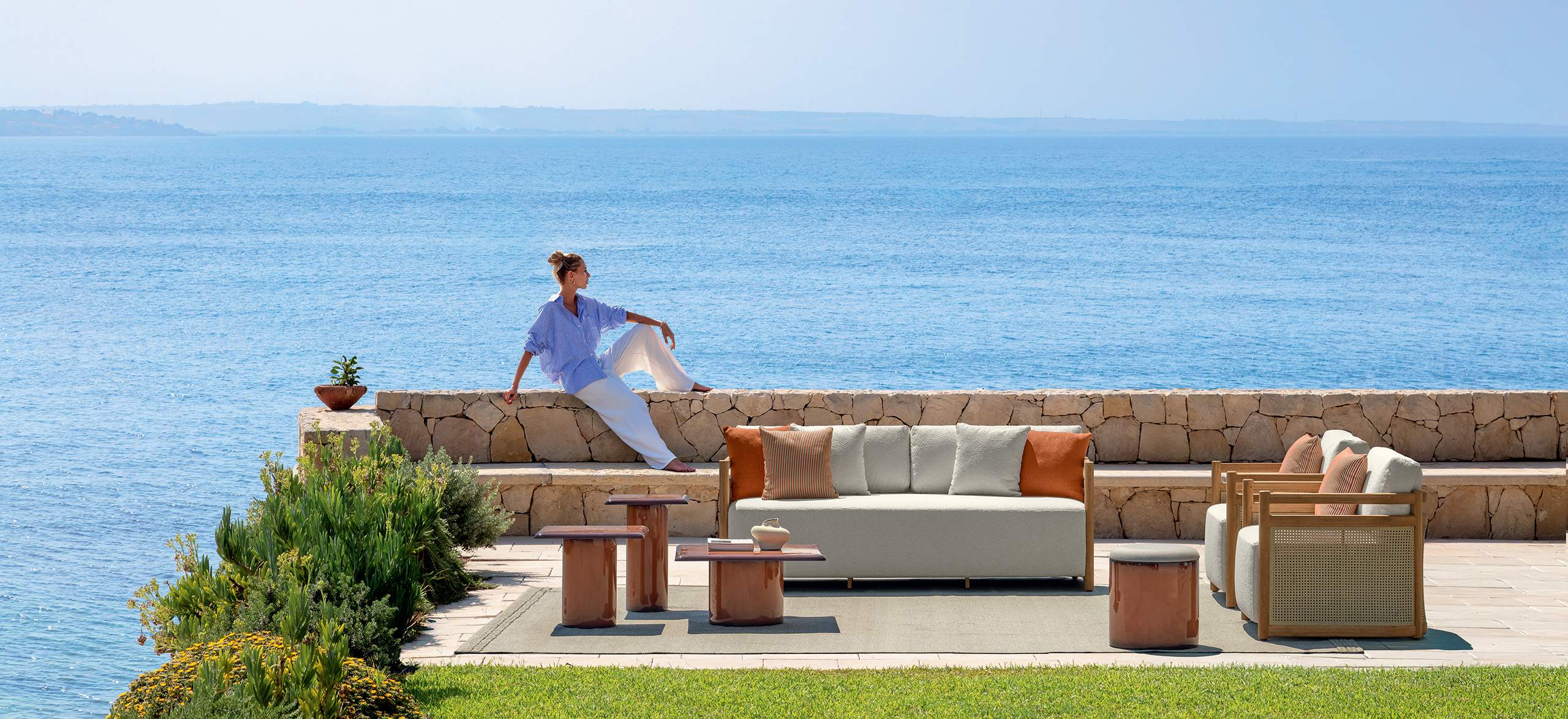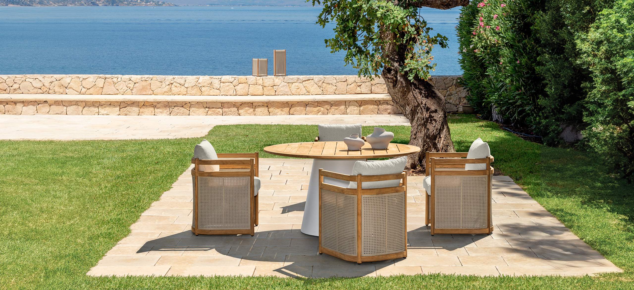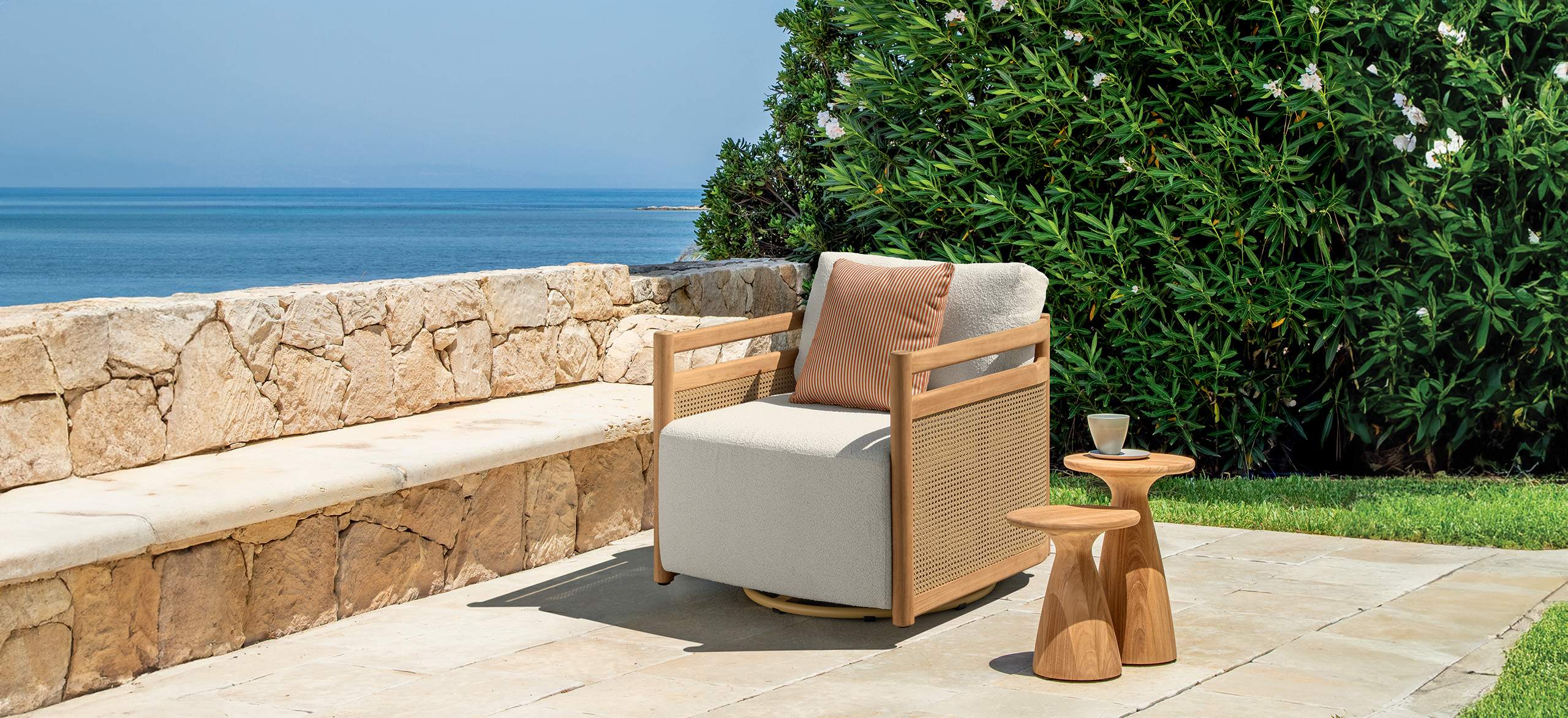 Edwin es una colección de exterior que celebra la belleza natural de la madera, combinada con líneas limpias y una estructura robusta para garantizar durabilidad y confort. Cada pieza está diseñada para realzar las vetas y los matices únicos de la teca, transformando los espacios al aire libre en entornos acogedores y refinados. El equilibrio entre tradición y modernidad se refleja en las formas esenciales, en la elección del tejido bouclé y en el uso del elegante trenzado de rejilla de Viena, célebre en la época victoriana y reelaborado en los siglos posteriores, dando vida a piezas de diseño de encanto atemporal.