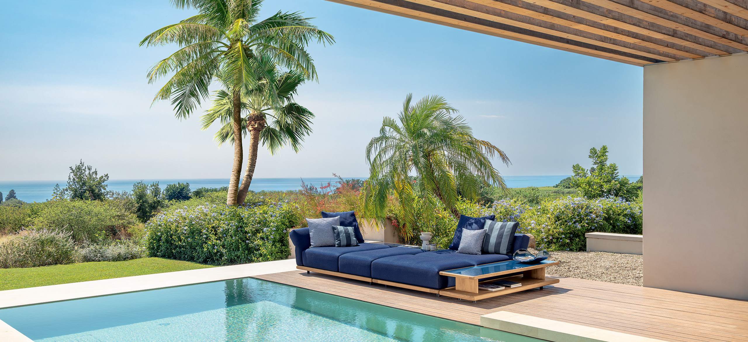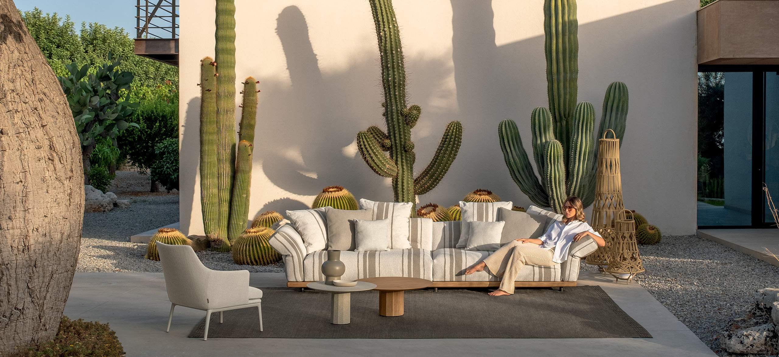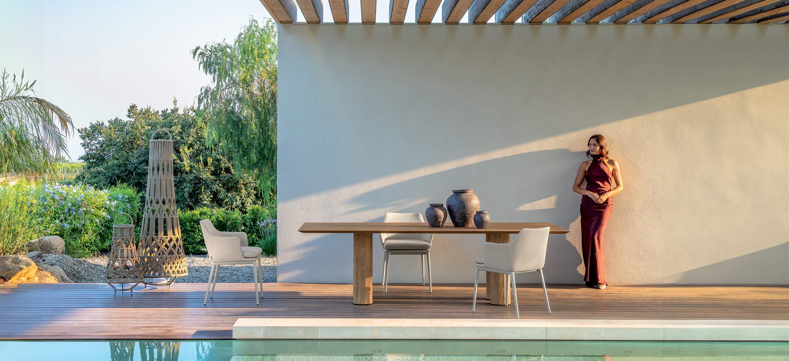 Elton es una colección que sublima la capacidad de Talenti de difuminar los límites entre interior y exterior a través de la sofisticación de las formas y los materiales. Una modularidad sin igual que introduce una nueva forma de vivir los espacios exteriores: por primera vez, los respaldos y los reposabrazos de los sofás se vuelven reclinables gracias a un mecanismo integrado en la estructura que permite regularlos. Tecnología al servicio del diseño, capaz de otorgar al sofá una sinuosidad estética sin precedentes y de jugar con la posibilidad de personalizar totalmente el propio confort. La colección también incluye mesas de centro en cálida madera de Accoya, natural o palisandro, embellecidas con elegantes sobres de vidrio esmaltado.
