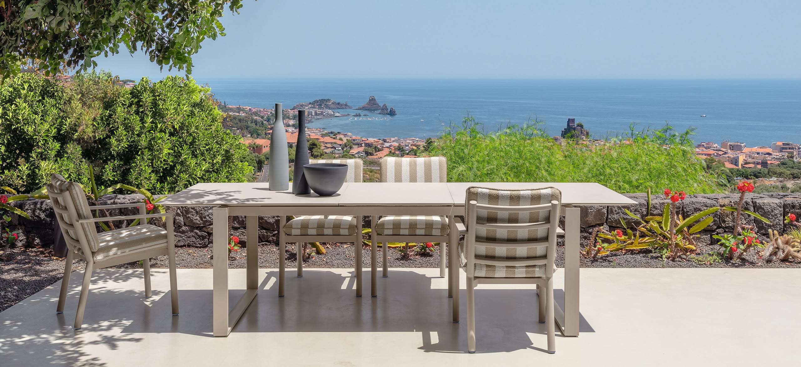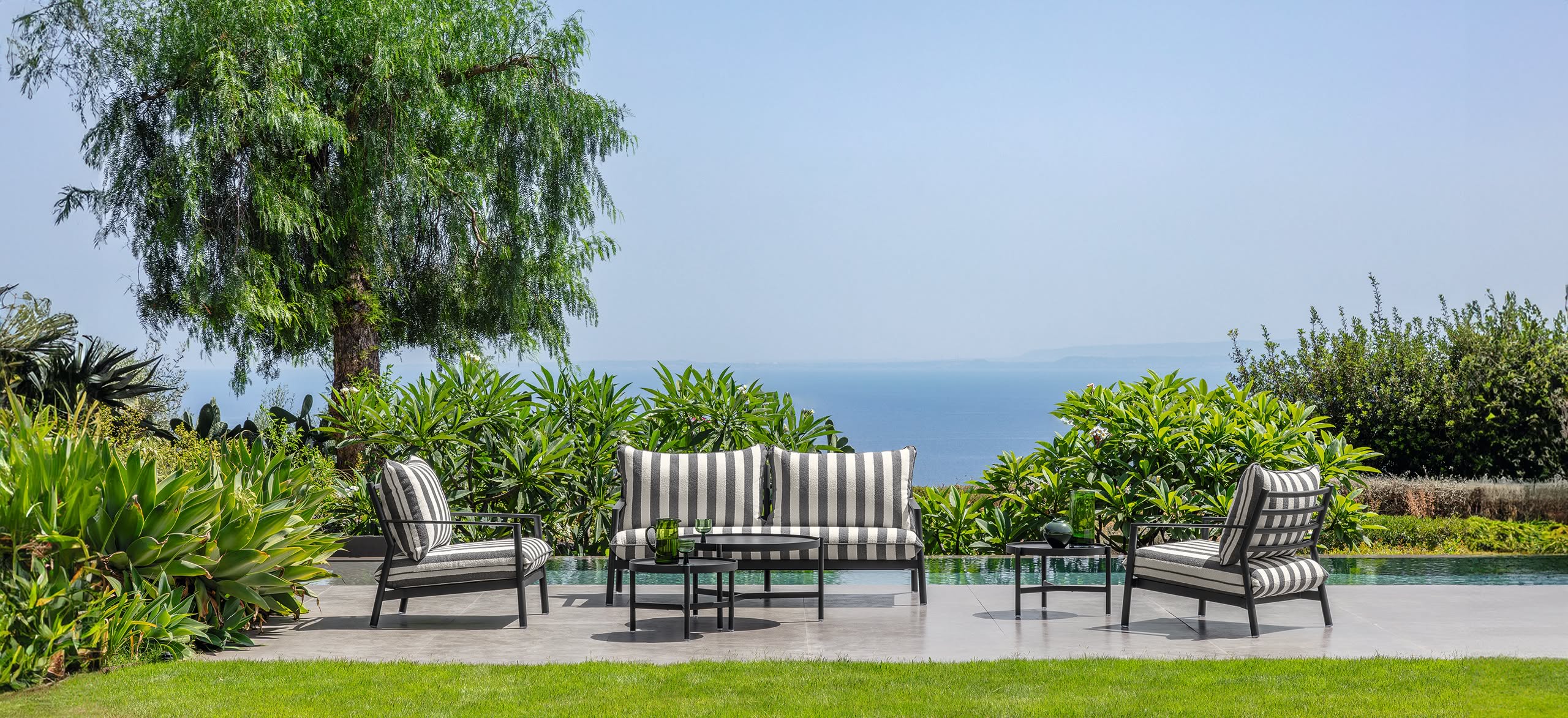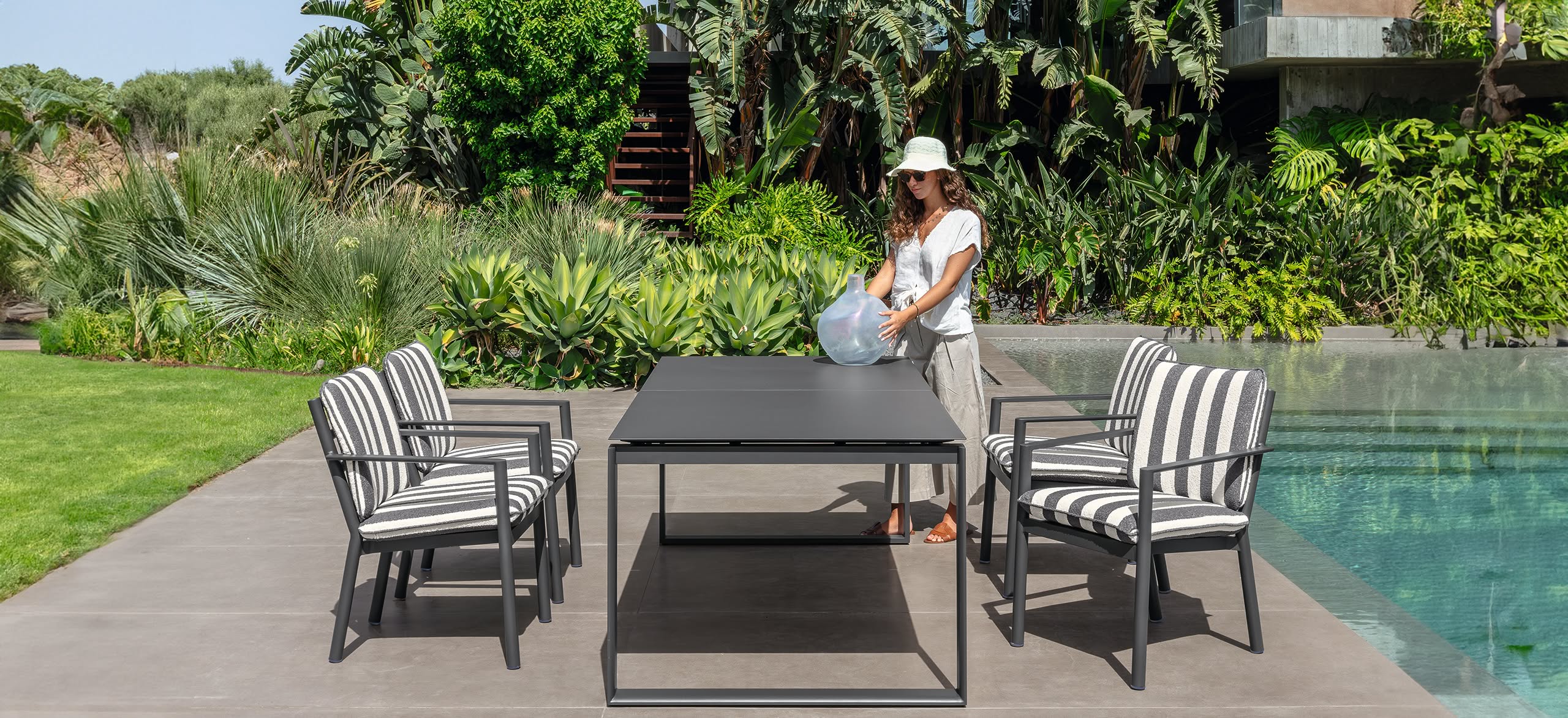 Líneas definidas, volúmenes sobrios y un tejido a rayas dibujan un perfil elegante pero discreto. Finn no pretende impresionar, sino integrarse con naturalidad en el paisaje, transformando terrazas, jardines y azoteas en lugares de calma funcional.