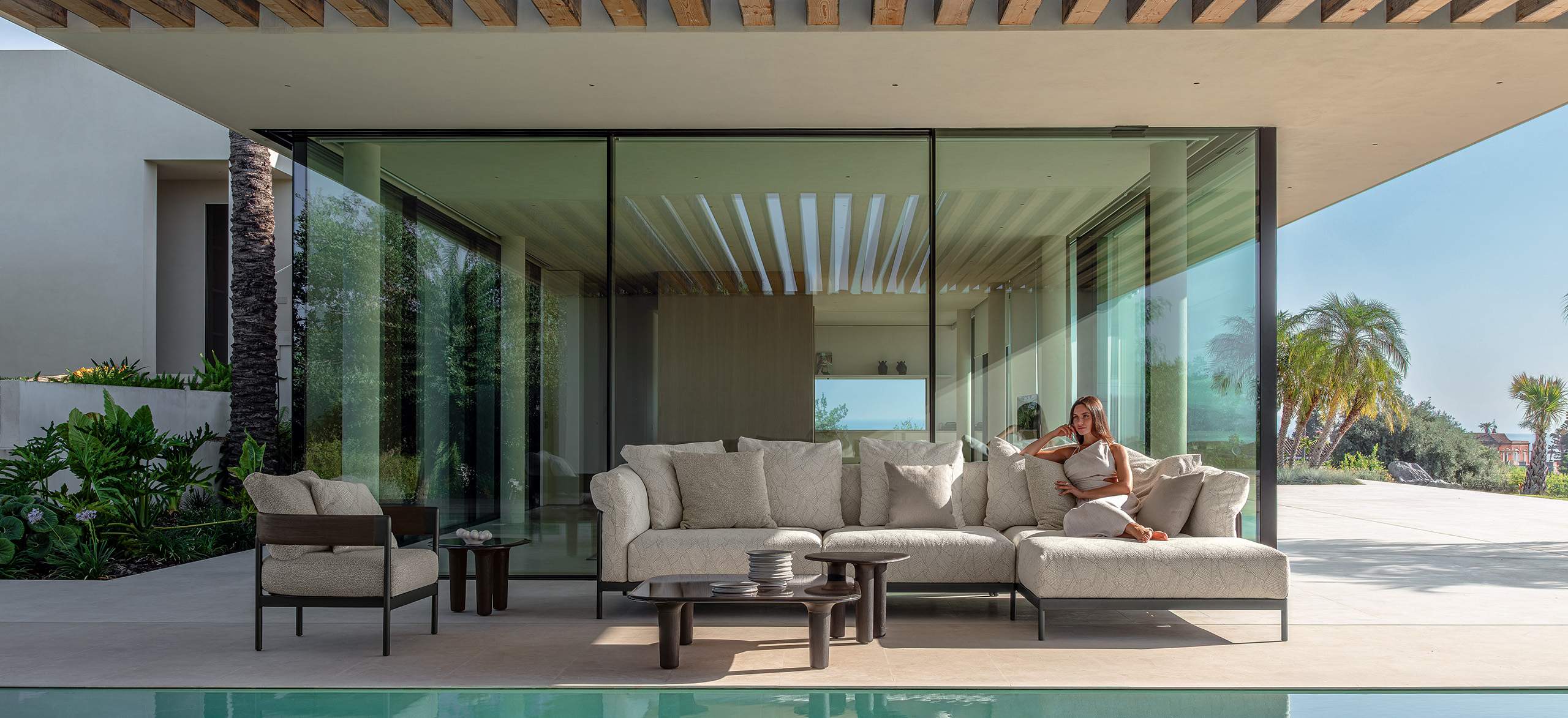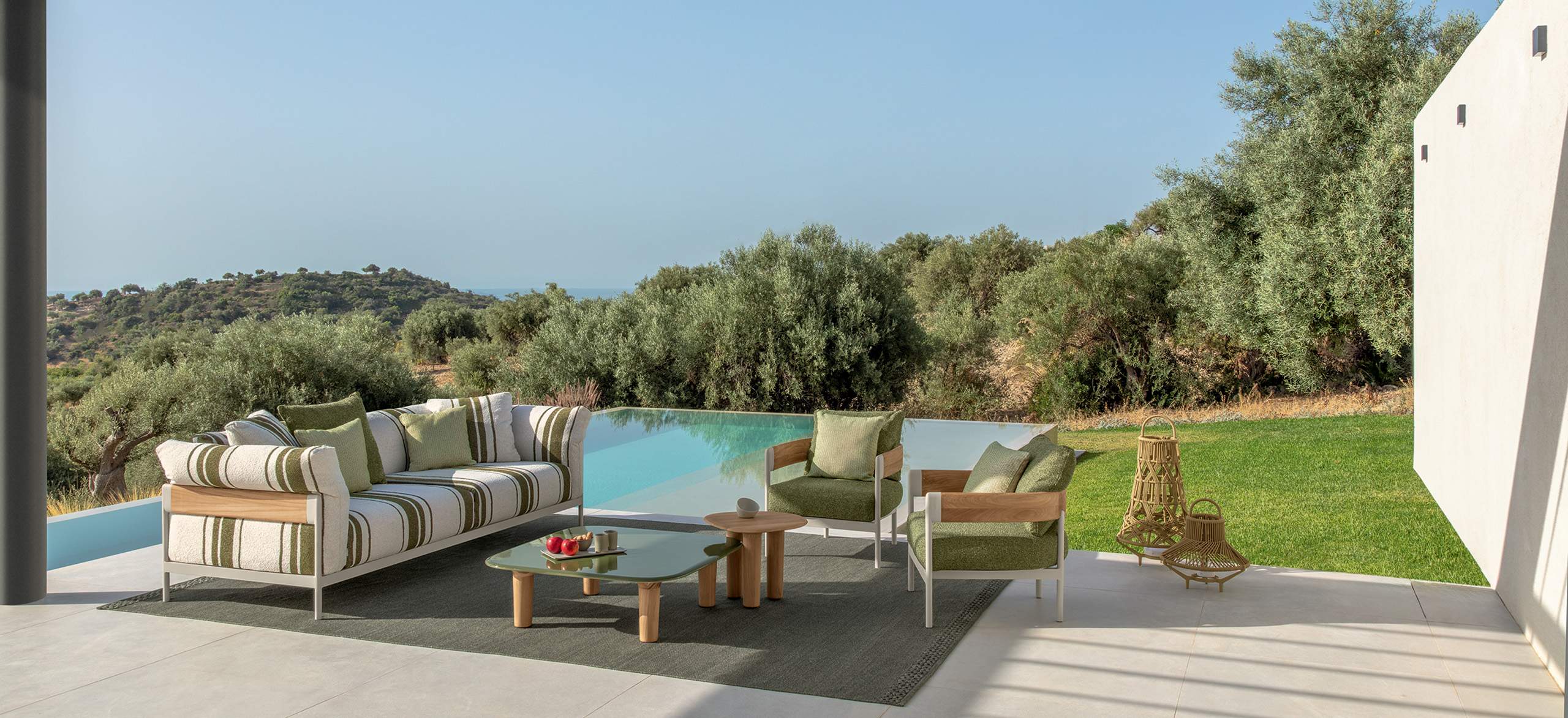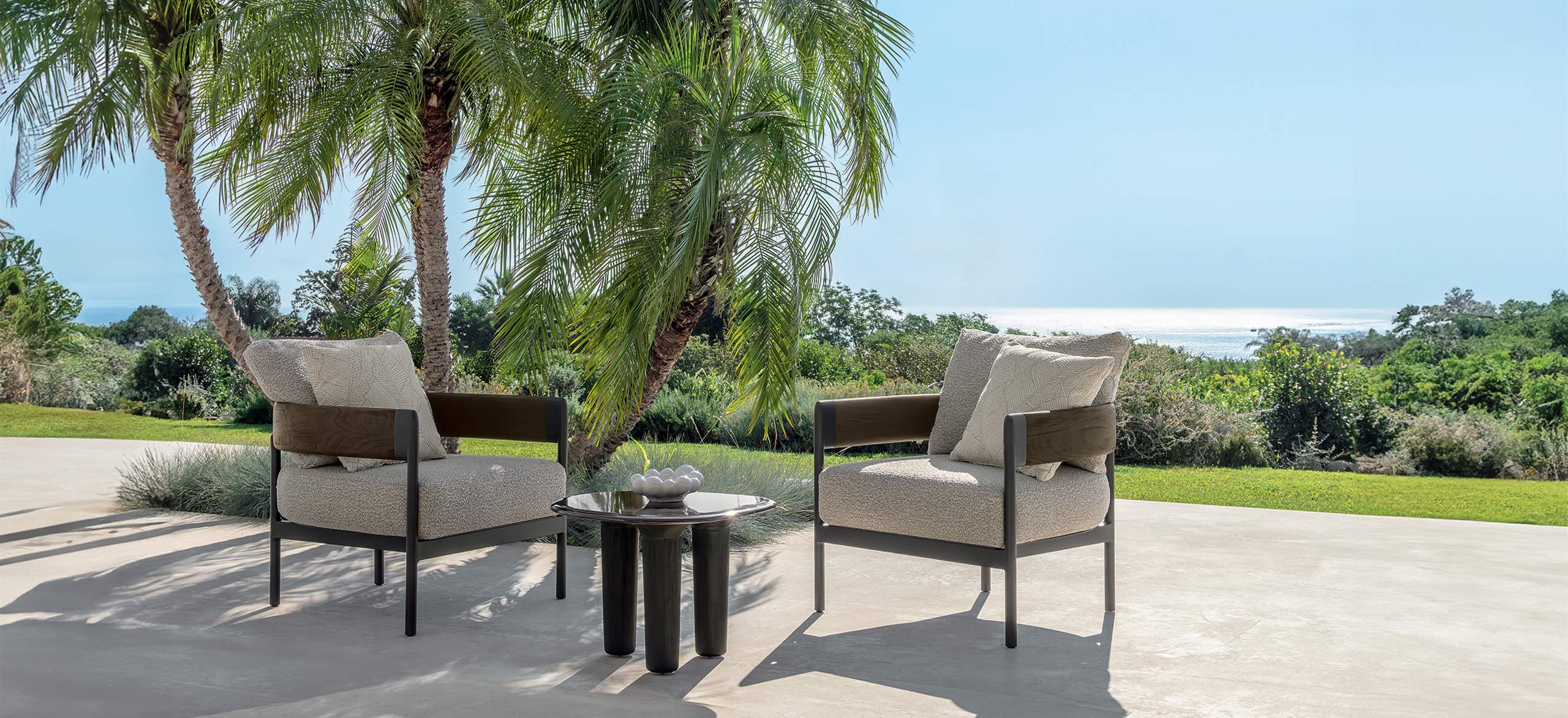 El confort y la multimaterialidad son los elementos clave de esta colección que, como evoca su nombre, quiere transmitir una sensación de fluidez, de bienestar vivido dejando que el tiempo de relax fluya libremente. Una recopilación de elementos donde los cojines envolventes, combinados con materiales refinados y tejidos a rayas de gran valor decorativo, contribuyen a llevar la atmósfera del interior a los espacios exteriores. La estructura de aluminio, en un elegante blanco cálido o en un más decidido moka, se integra armoniosamente con los sinuosos trabajos de madera, realzando el saber hacer de Talenti en la creación de mobiliario que fusiona materiales aparentemente distantes. El resultado es una mezcla refinada y natural entre el calor tradicional de la teca y la fuerza estética de los elementos lacados, capaz de dar forma a una familia de productos completa y versátil que incluye sofás modulares, sillones lounge, mesas y sillas de comedor, así como soluciones de relax.