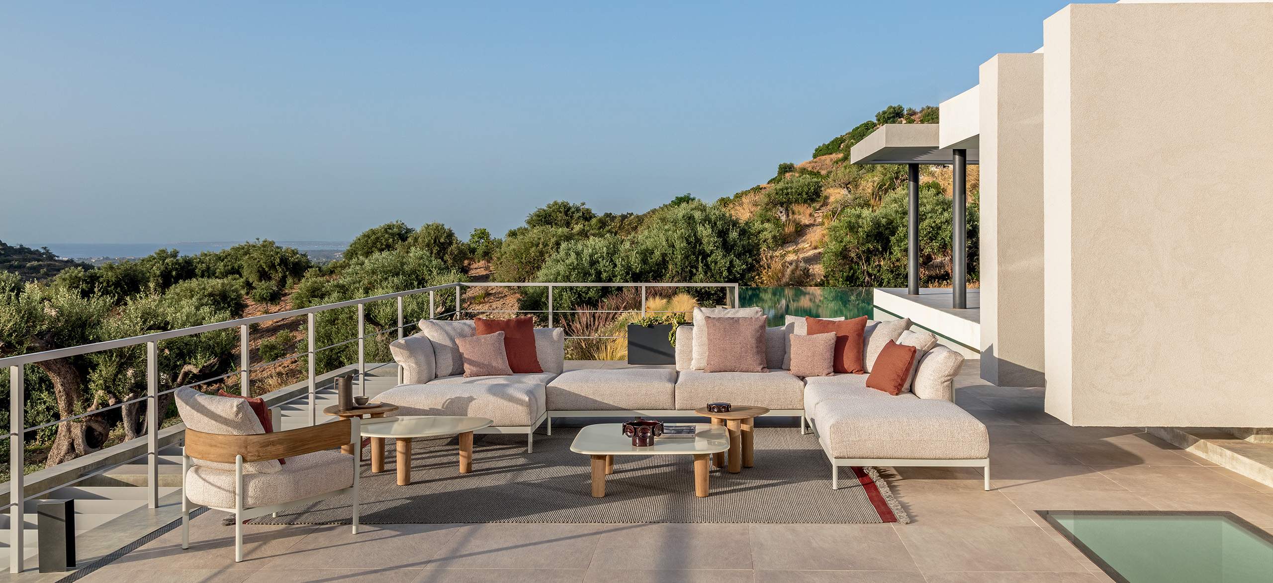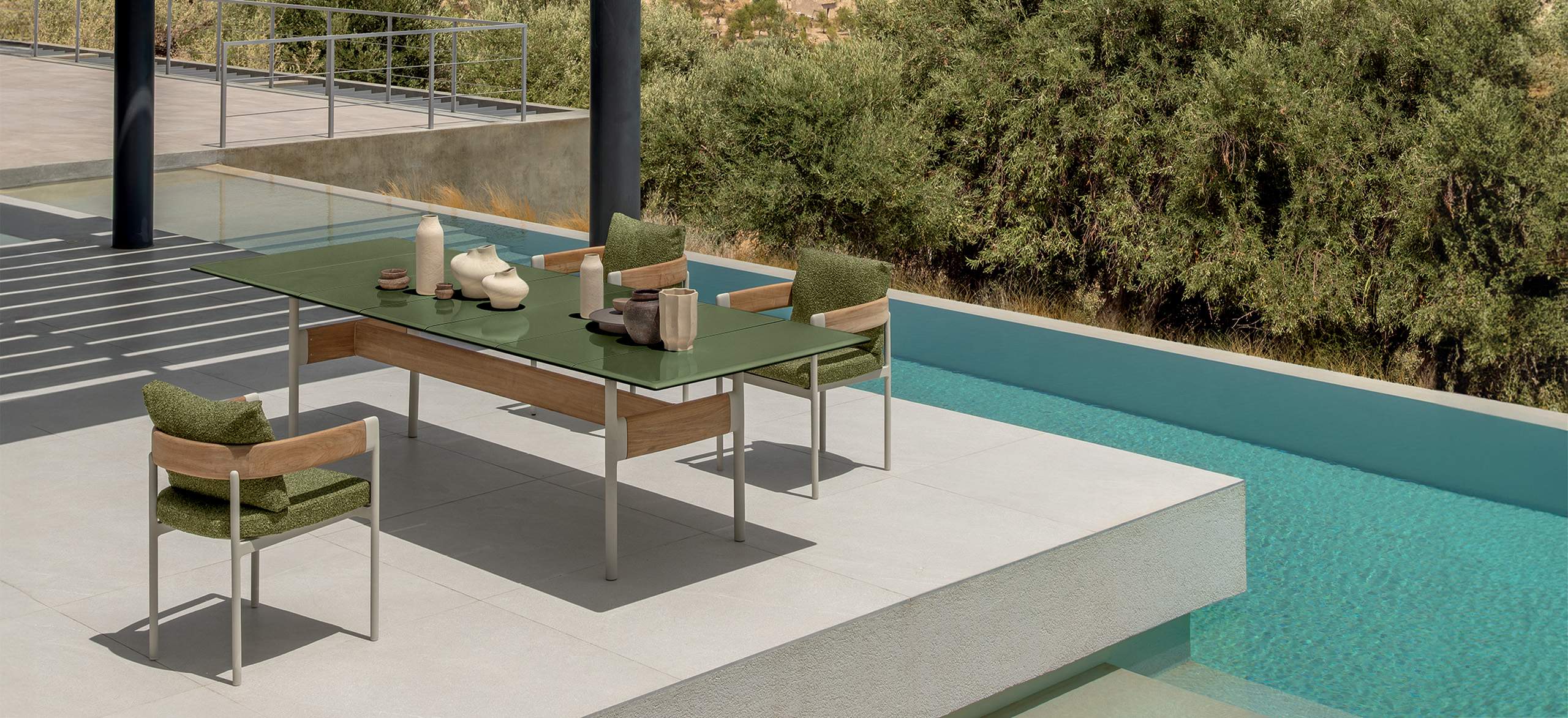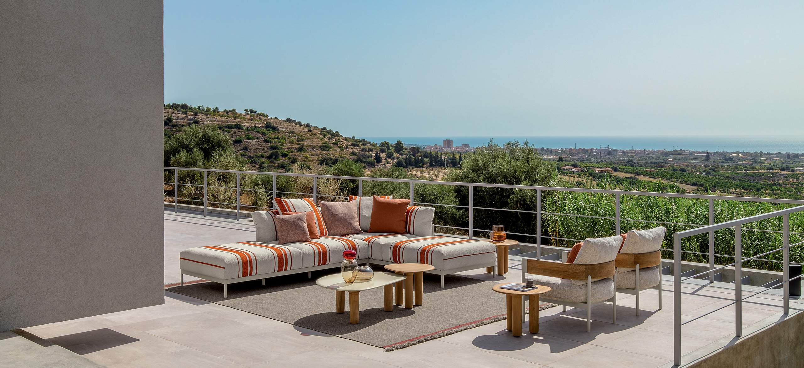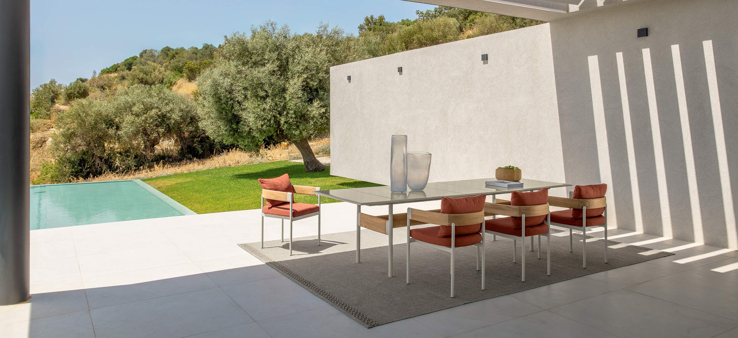 El confort y la multimaterialidad son los elementos clave de esta colección que, como evoca su nombre, quiere transmitir una sensación de fluidez, de bienestar vivido dejando que el tiempo de relax fluya libremente. Una recopilación de elementos donde los cojines envolventes, combinados con materiales refinados y tejidos a rayas de gran valor decorativo, contribuyen a llevar la atmósfera del interior a los espacios exteriores. La estructura de aluminio, en un elegante blanco cálido o en un más decidido moka, se integra armoniosamente con los sinuosos trabajos de madera, realzando el saber hacer de Talenti en la creación de mobiliario que fusiona materiales aparentemente distantes. El resultado es una mezcla refinada y natural entre el calor tradicional de la teca y la fuerza estética de los elementos lacados, capaz de dar forma a una familia de productos completa y versátil que incluye sofás modulares, sillones lounge, mesas y sillas de comedor, así como soluciones de relax.