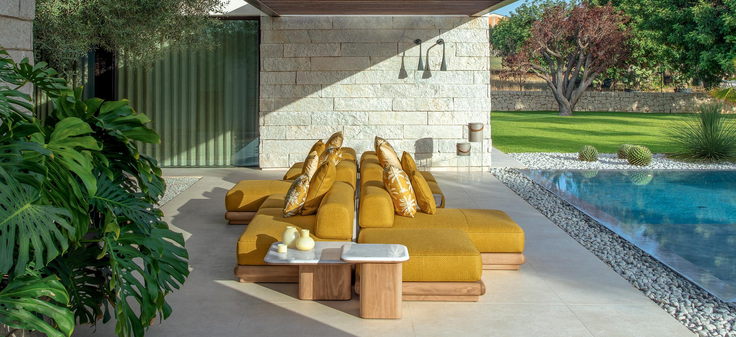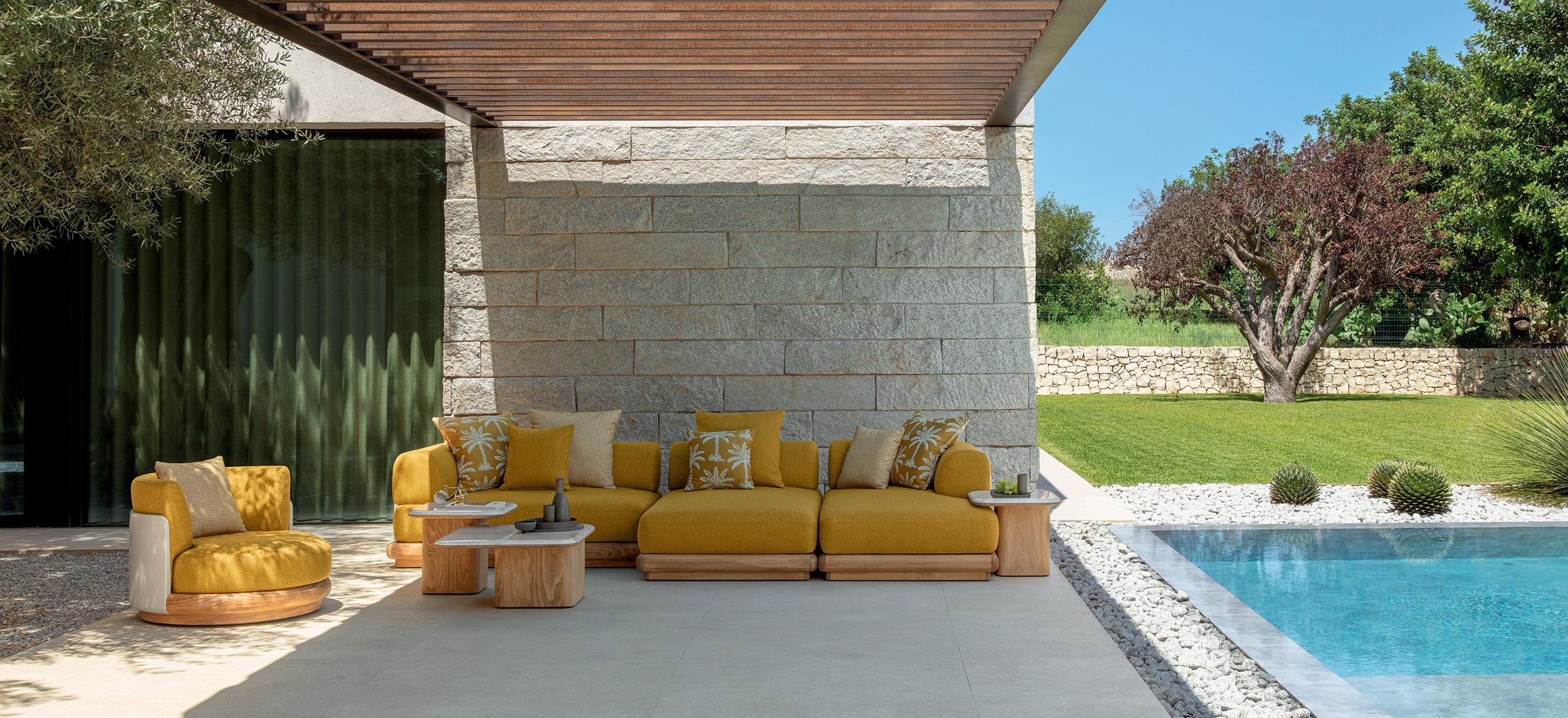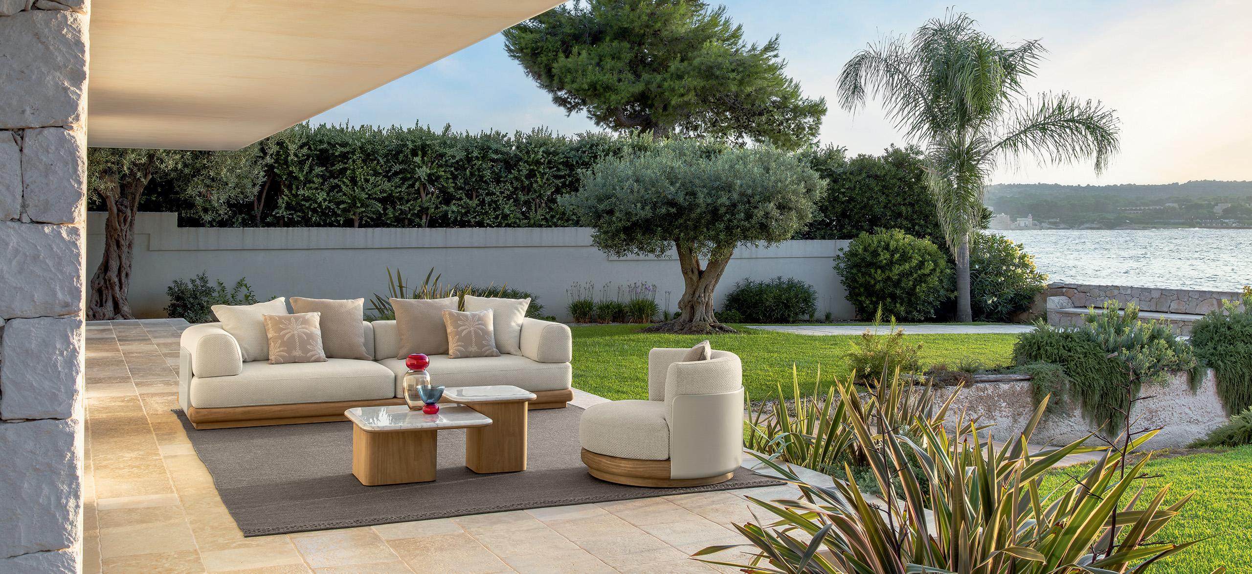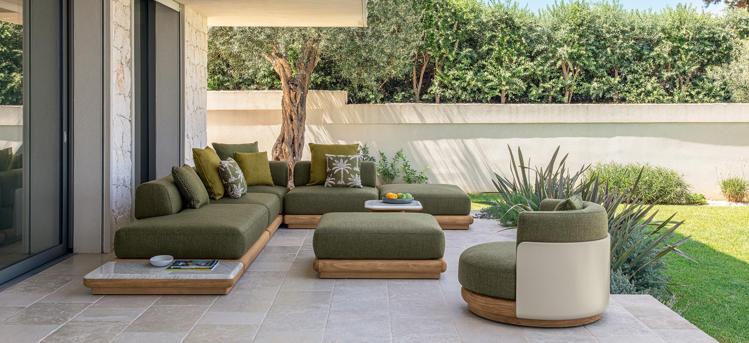 Itaca es una invitación a vivir su espacio al aire libre con elegancia y confort, a través de una componibilidad sin precedentes. Inspirándose en el icónico viaje de Ulises por mares y tierras lejanas, Carlo Colombo da vida a un oasis de placer donde encontrarse, para disfrutar de la familiaridad de su propio rincón de paraíso al aire libre. Al igual que las islas de un archipiélago, los coloridos módulos de Ítaca se agrupan y dividen para formar composiciones siempre originales, en continuo movimiento y capaces de adaptarse a cualquier necesidad de espacio o uso. Los perfiles redondeados, como si fueran suavizados por las olas, caracterizan al Accoya®, utilizado para las sólidas bases, en las variantes de color miel y palisandro, y se reproponen en las secciones de mármol y travertino que embellecen las mesas de café y comedor para completar la colección.