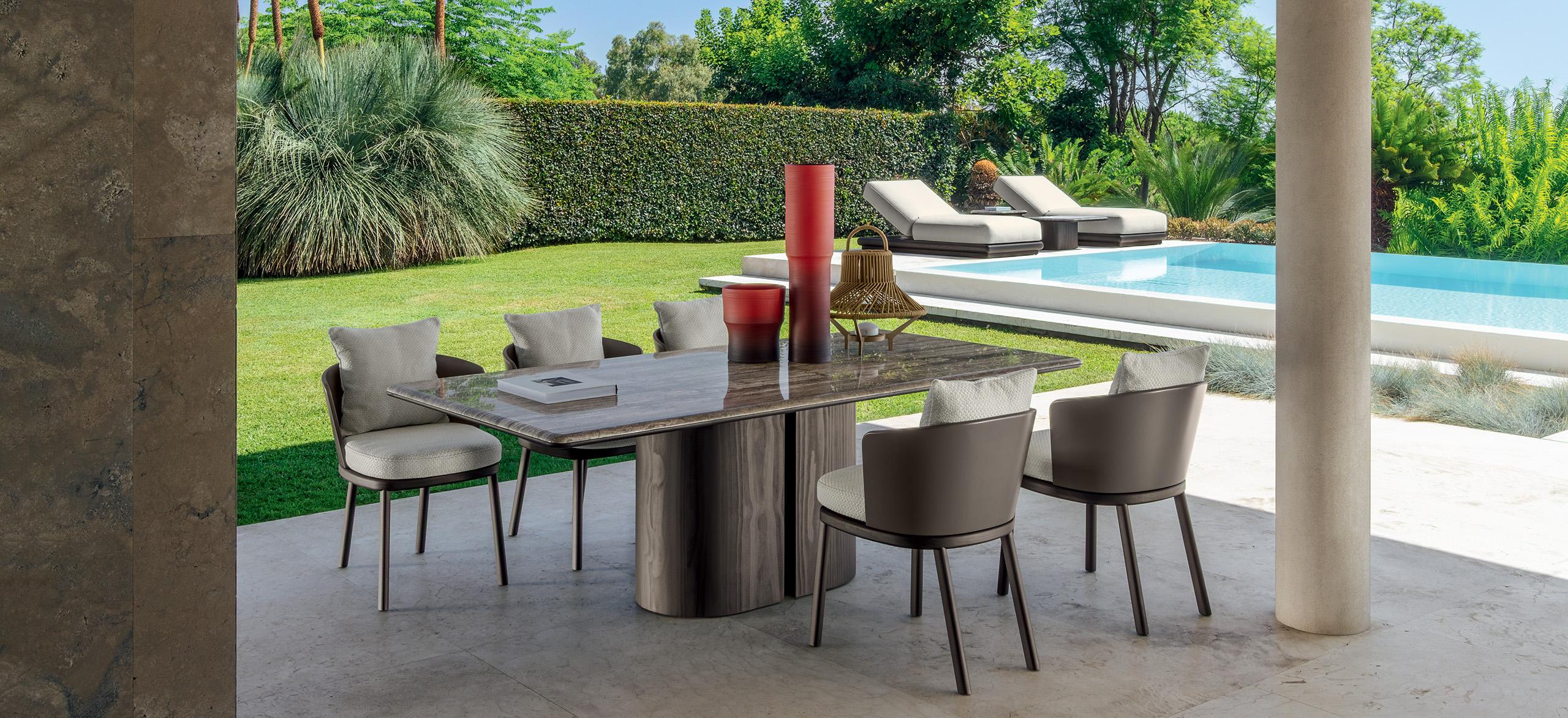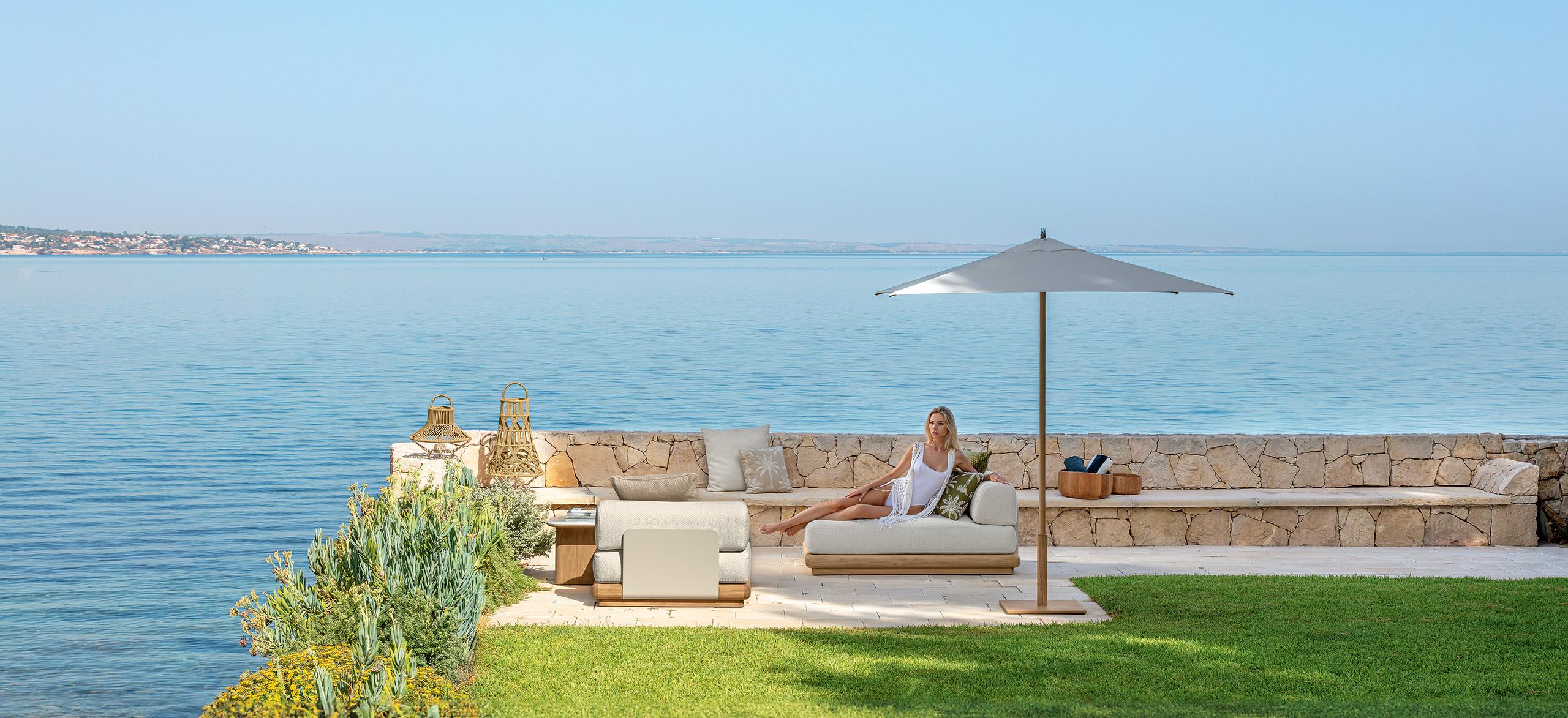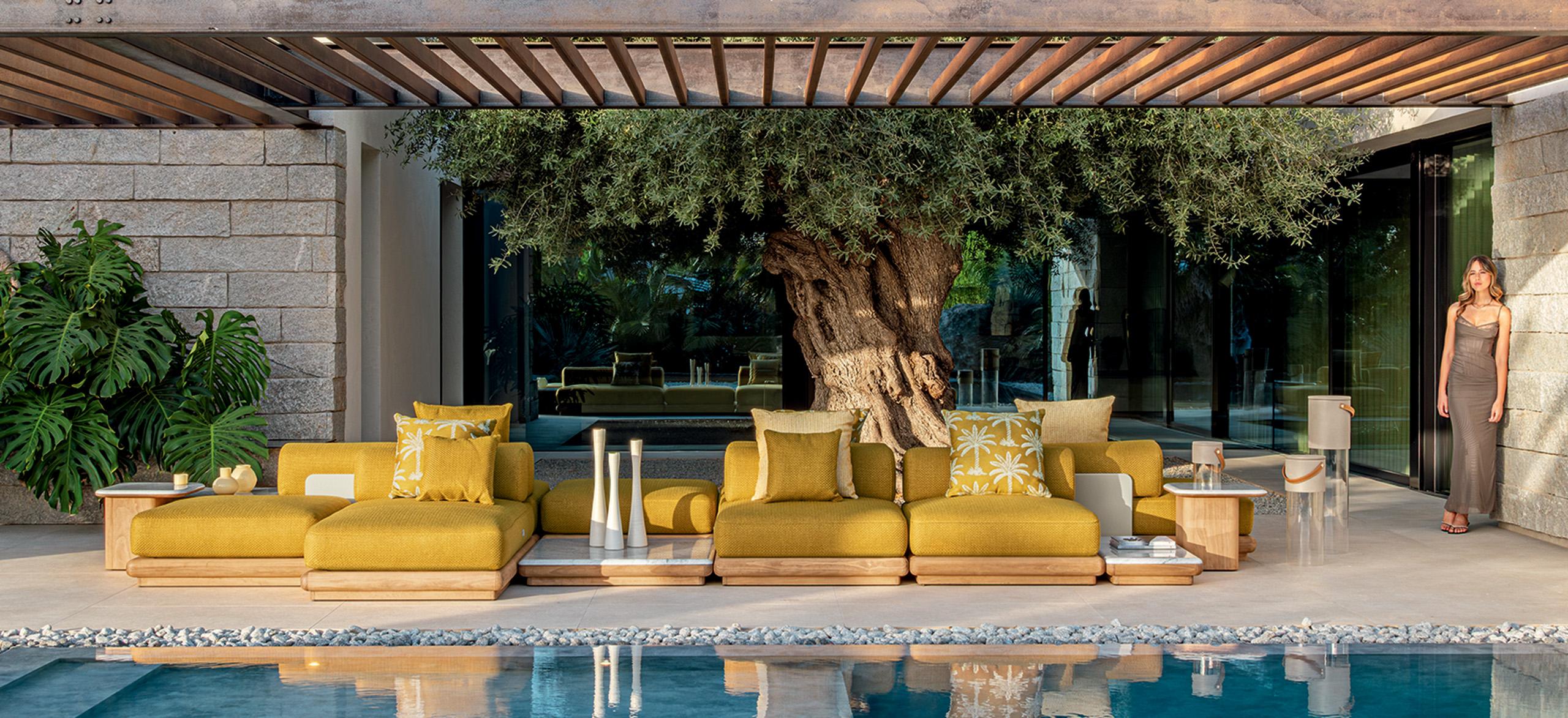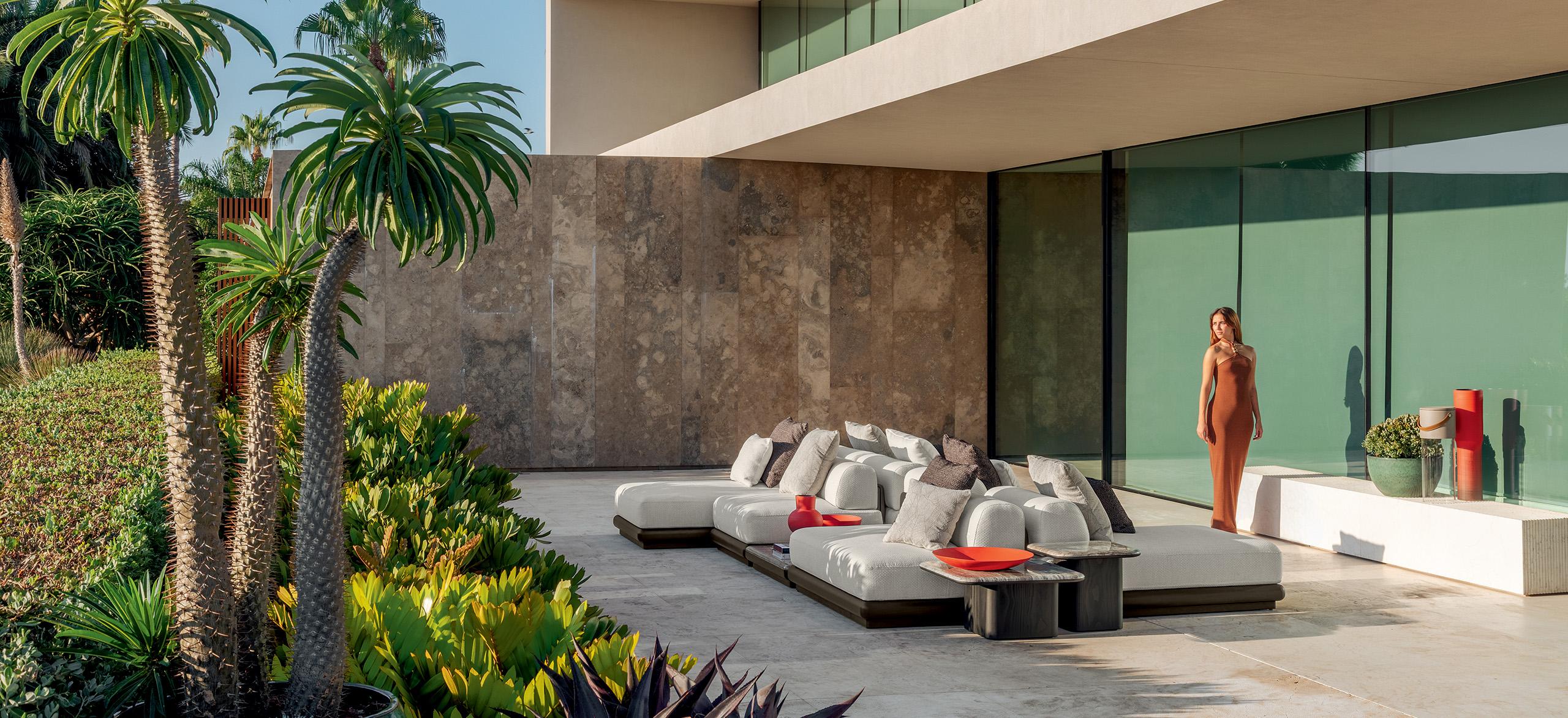 Itaca es una invitación a vivir su espacio al aire libre con elegancia y confort, a través de una componibilidad sin precedentes. Inspirándose en el icónico viaje de Ulises por mares y tierras lejanas, Carlo Colombo da vida a un oasis de placer donde encontrarse, para disfrutar de la familiaridad de su propio rincón de paraíso al aire libre. Al igual que las islas de un archipiélago, los coloridos módulos de Ítaca se agrupan y dividen para formar composiciones siempre originales, en continuo movimiento y capaces de adaptarse a cualquier necesidad de espacio o uso. Los perfiles redondeados, como si fueran suavizados por las olas, caracterizan al Accoya®, utilizado para las sólidas bases, en las variantes de color miel y palisandro, y se reproponen en las secciones de mármol y travertino que embellecen las mesas de café y comedor para completar la colección.