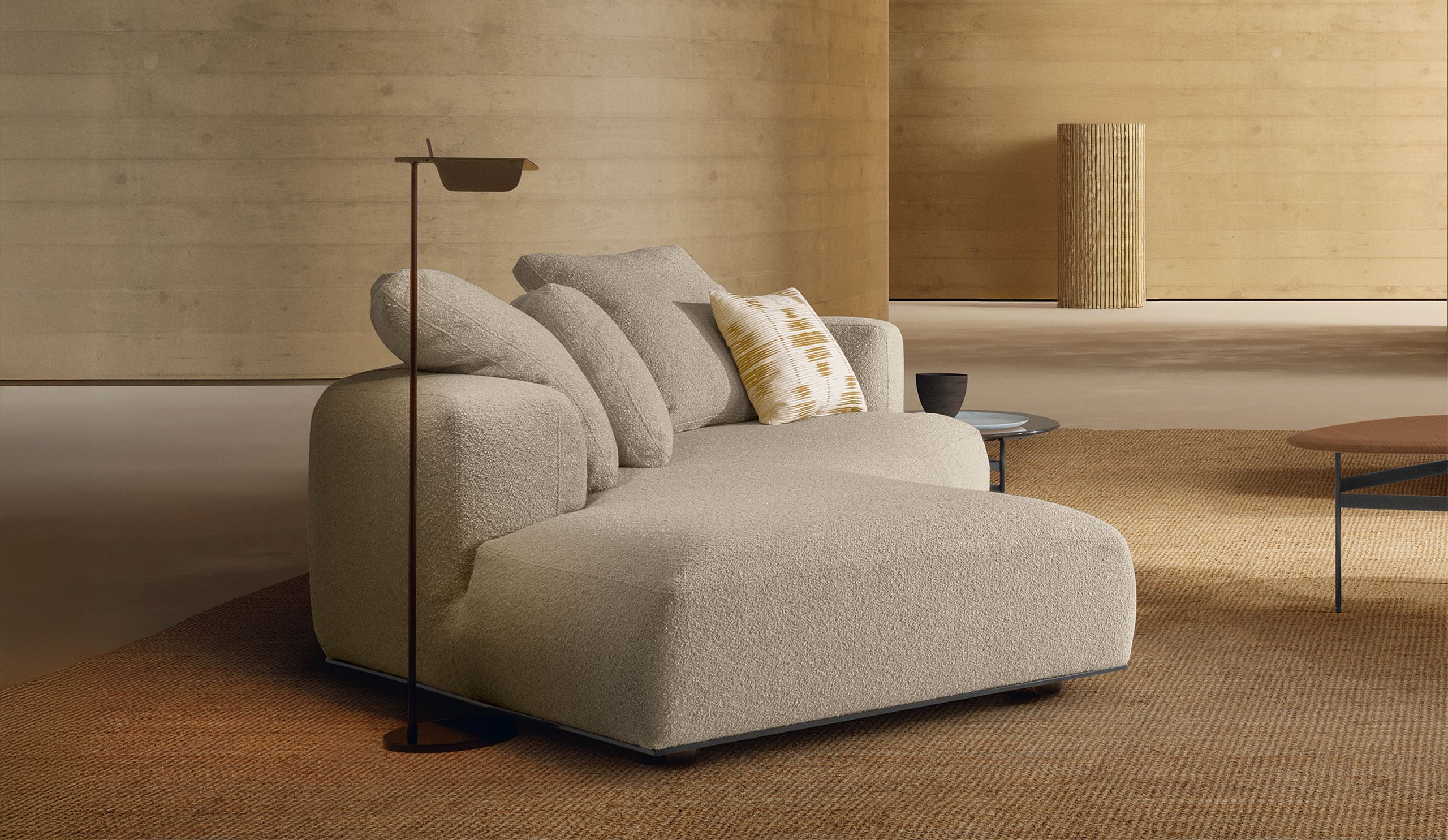 PACO oblicuo introduce dinamismo en la colección al romper con la linealidad tradicional. Su forma inclinada aporta movimiento al espacio y favorece una distribución más fluida y contemporánea. La sentada profunda conserva el confort distintivo de PACO, convirtiendo el sofá en un elemento arquitectónico de fuerte impacto visual.