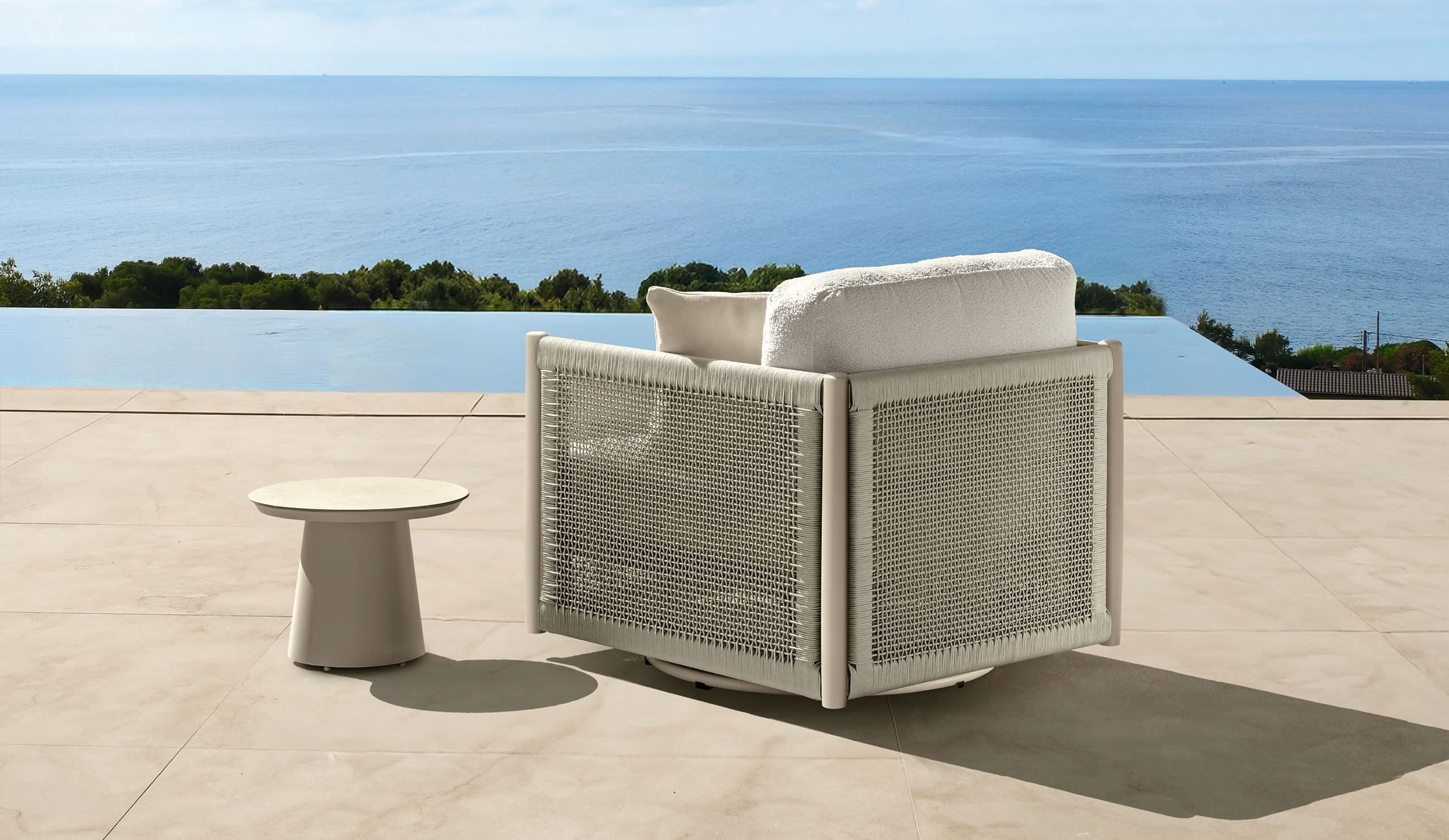 La butaca living de aluminio combina elegancia, confort y funcionalidad en una forma armónica y equilibrada. Su estructura sólida, aligerada por el trenzado lateral y disponible en dos acabados, destaca por su perfecto equilibrio entre diseño y resistencia. La base giratoria aporta un toque de dinamismo, ofreciendo libertad de movimiento y un confort natural. Los cojines en tonos neutros completan el conjunto, convirtiendo esta butaca en un elemento refinado y versátil, ideal para realzar con estilo cualquier espacio exterior.