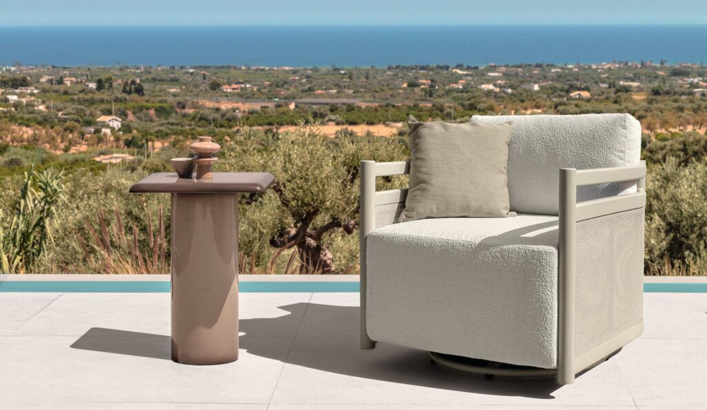 El sillón de salón giratorio Edwin Alu se presta a crear zonas lounge también de grandes dimensiones gracias a la versatilidad con la que se puede disfrutar de su confort esencial. En aluminio moka o blanco cálido, con estructura enriquecida por una fibra ultra slim, en las mismas tonalidades, extremadamente resistente a los agentes atmosféricos, se adapta tanto a ambientes más tradicionales como a los más modernos y vanguardistas. El tejido bouclé en blanco crema, hace que el sillón sea un mueble versátil pero de gran elegancia.