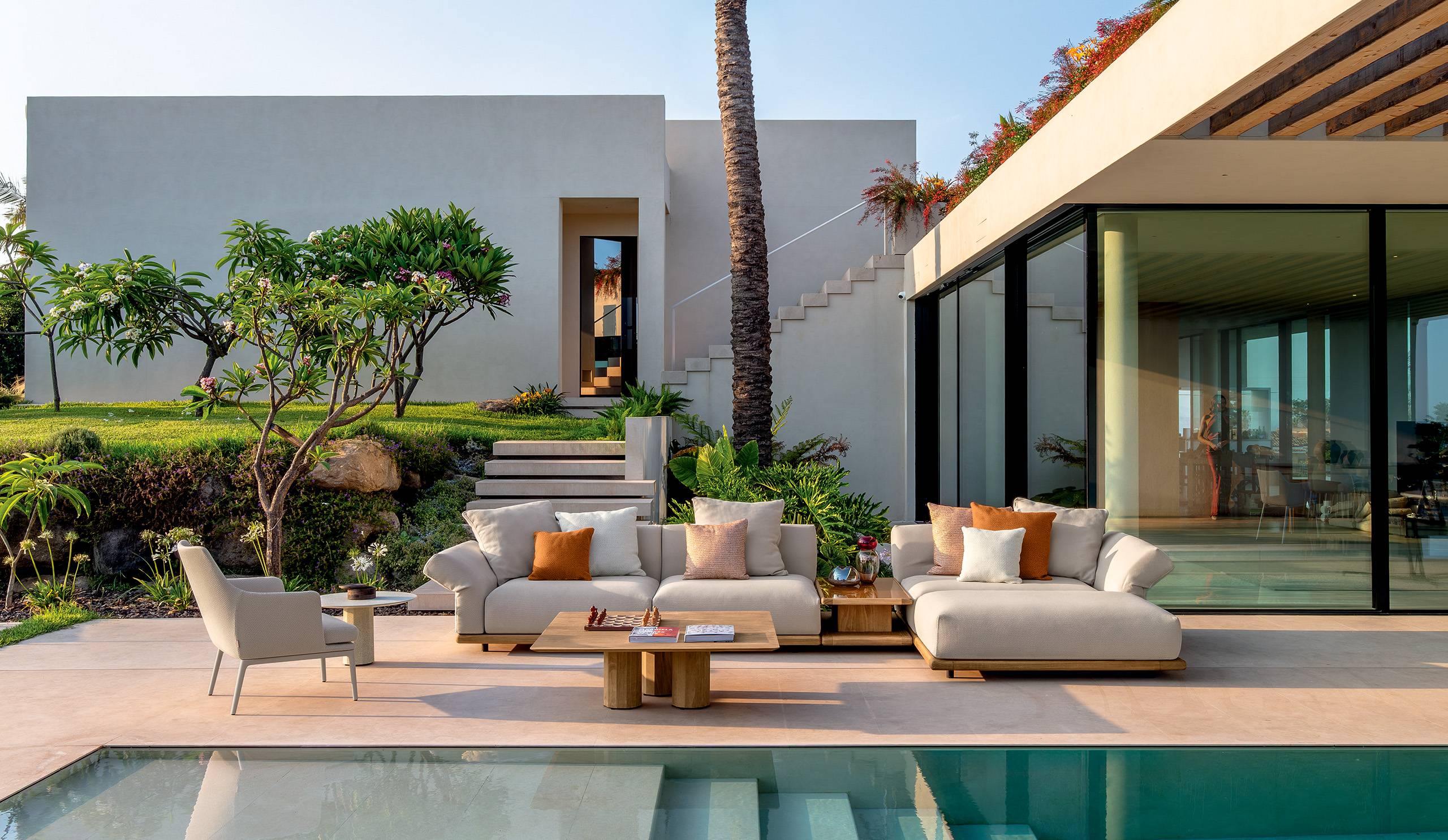 La mesa de centro Elton es un concentrado de elegancia. Con su característica doble altura, funciona como superficie independiente o como mesa auxiliar que completa la composición modular, uniéndose a los elementos tapizados mediante la elección de materiales. Su sólida estructura en madera de Accoya, disponible en dos acabados – natural o palisandro – y su sobre de vidrio templado pintado en el reverso, en tonos de blanco, naranja y azul ultramar, la convierten en una pieza de encanto plenamente italiano.