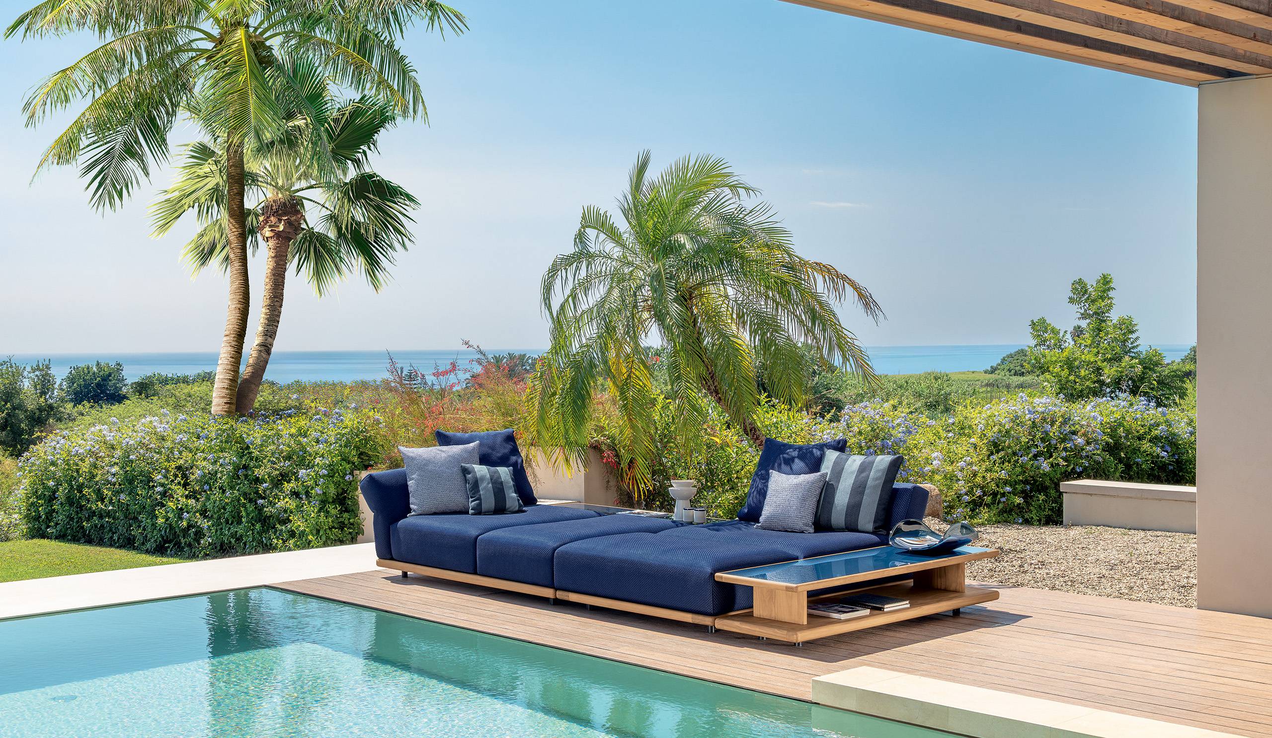 La mesa de centro Elton es un concentrado de elegancia. En su versión más amplia, diseñada para completar composiciones de gran tamaño, juega con la característica doble altura y se une a los elementos tapizados a través de la elección de materiales. Su sólida estructura en madera de Accoya, disponible en dos acabados – natural o palisandro – y su sobre de vidrio templado pintado en el reverso, en tonos de blanco, naranja y azul ultramar, la convierten en una pieza de encanto plenamente italiano.