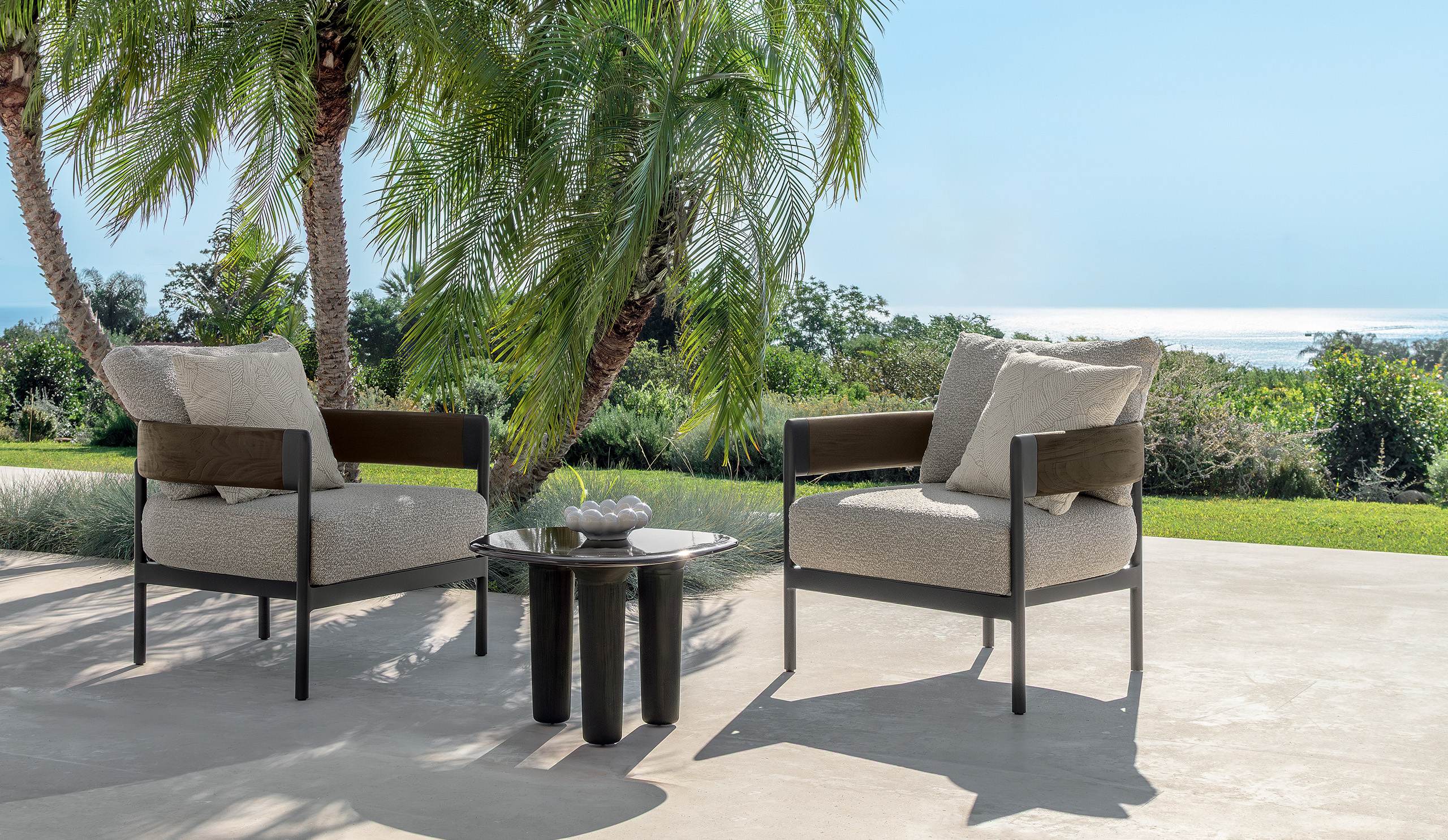 La butaca lounge está pensada para quienes buscan un relax total, en un espacio dedicado a la contemplación y al bienestar. Sus formas suaves y generosas se realzan con la unión del aluminio lacado y el calor de la teca, una combinación que transmite equilibrio y armonía. Los tejidos seleccionados, también disponibles en versión a rayas decorativas, enriquecen la pieza y aportan un toque sofisticado al espacio exterior, transformando cada momento en una experiencia de puro confort.