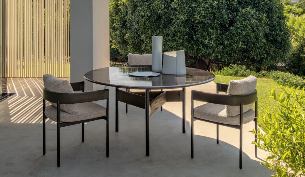 La mesa de comedor D150 encarna el sentido de convivencia y de compartir típico de los espacios al aire libre. Sus líneas armónicas y equilibradas se desarrollan alrededor de una estructura de aluminio sólida y elegante, enriquecida con detalles en teca que subrayan su refinamiento natural. Pensada para almuerzos, cenas y encuentros, combina el calor de la madera con la fuerza estética del gres esmaltado en blanco leche o verde oliva, llevando la elegancia del interior al exterior.