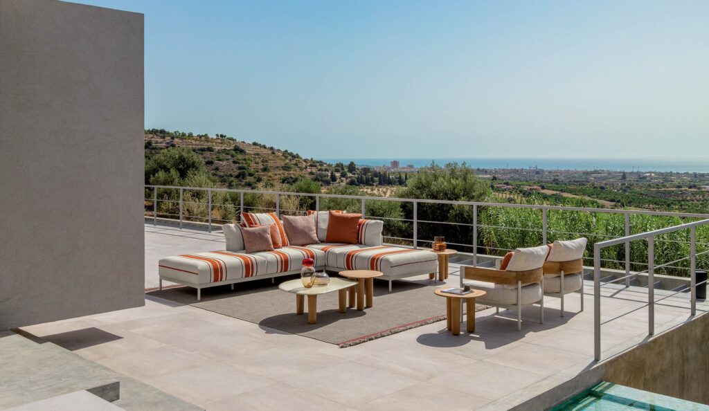 El sofá modular representa la esencia de la colección: un sistema flexible y versátil que permite infinitas composiciones, adaptándose con natural elegancia a espacios amplios o íntimos. La estructura de aluminio, en acabados refinados blanco cálido o moka, dialoga armoniosamente con la teca y con tejidos a rayas de gran valor decorativo. Los cojines generosos y envolventes aumentan el confort, transformando el salón exterior en un oasis personalizado de bienestar.