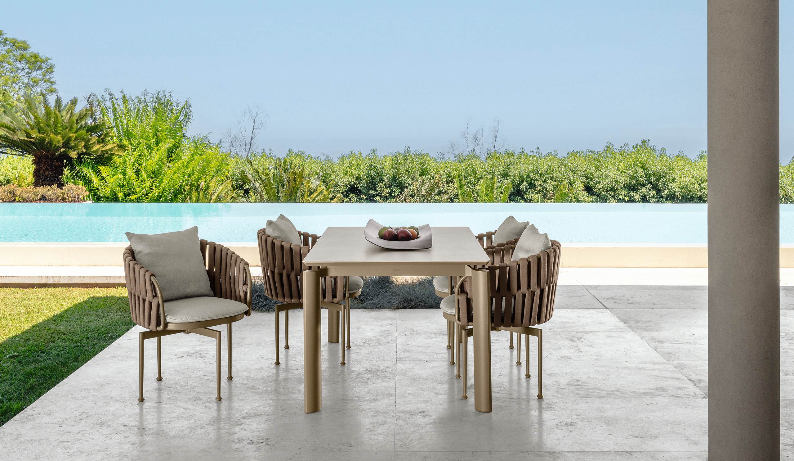 La Butaca de Comedor Frame encarna la esencia de la colección, transformando la ligereza y el confort en una única y refinada pieza. La estructura de aluminio, esbelta y armoniosa, dialoga con los volúmenes suaves del acolchado y con el trenzado de cuerda rellena que envuelve el respaldo. La base giratoria aporta un toque de dinamismo, ofreciendo libertad de movimiento que realza el placer de la convivencia. Sensual y elegante, es el elemento perfecto para enriquecer con estilo cualquier espacio exterior.