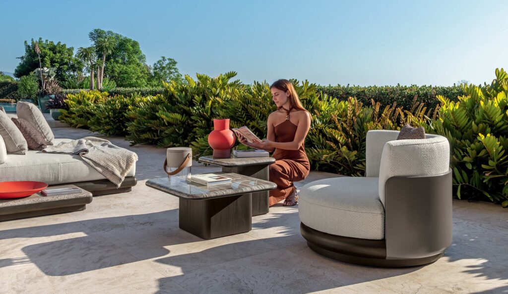 Elemento de decoración, pero dotado de una funcionalidad intrínseca, la mesa de café Itaca 70×70 replica la mesa de comedor pero reduciendo sus dimensiones. Base en Accoya® con perfiles redondeados, Coronado por tapas biseladas en elegante mármol blanco de Carrara o Travertino titanio, hacen de este plano de apoyo una joya preciosa que se puede combinar con los asientos y su gemelo de la profundidad reducida y con el que se realiza un juego arquitectónico de alturas.