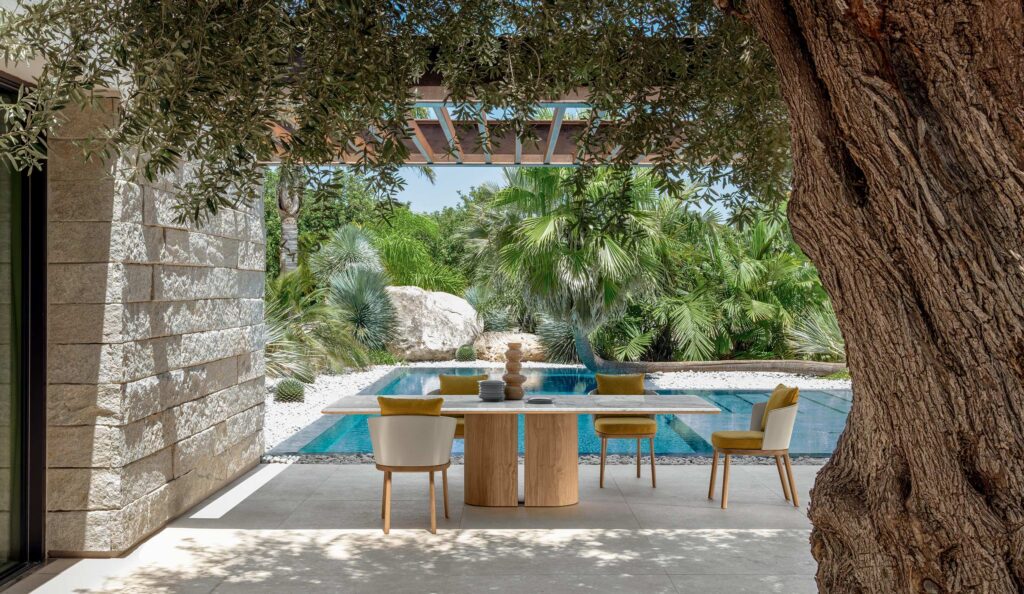 Perfectamente en línea con las estructuras de los sofás, la mesa de comedor Itaca de 280 centímetros de longitud tiene capacidad para 10 asientos y se compone de una base monolítica en Accoya®, con dos patas centrales semi circulares de superficie facetada, en doble coloración natural teak o palisandro, y un top en clásico y elegante mármol blanco de Carrara o en el más moderno Travertino Titanio, con tonos que van del bronce al beige, con vetas especiales gris humo.