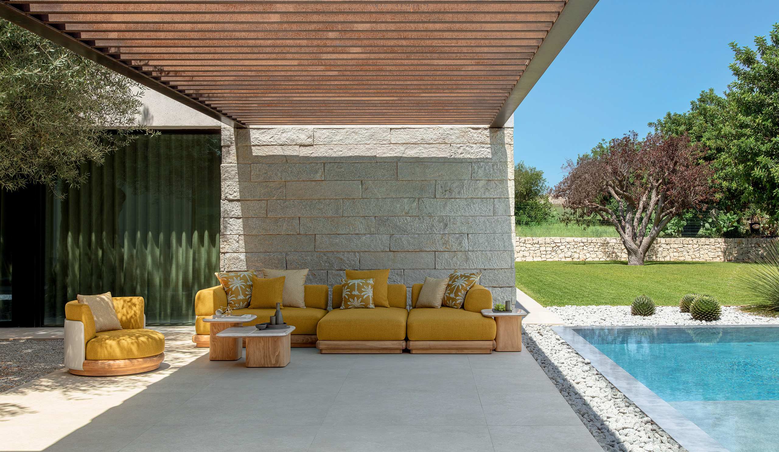 Icónica pieza stand-alone de la colección Itaca es el sillón living giratorio. Con una sólida base circular en Accoya®, en el que un respaldo perfectamente curvo se ajusta para acoger los cojines de asiento y respaldo como si formaran un cómodo nido, el mecanismo que hace que el sillón sea móvil, encaja perfectamente en el concepto que inspiró al diseñador en el diseño de toda la línea: personalizable, en tamaño y uso.