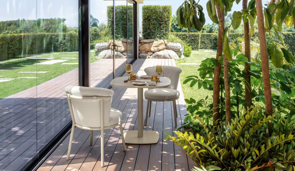 La estructura de aluminio pintado dialoga con la textura del tablero, dando vida a un conjunto refinado y contemporáneo que realza cualquier espacio interior o exterior.