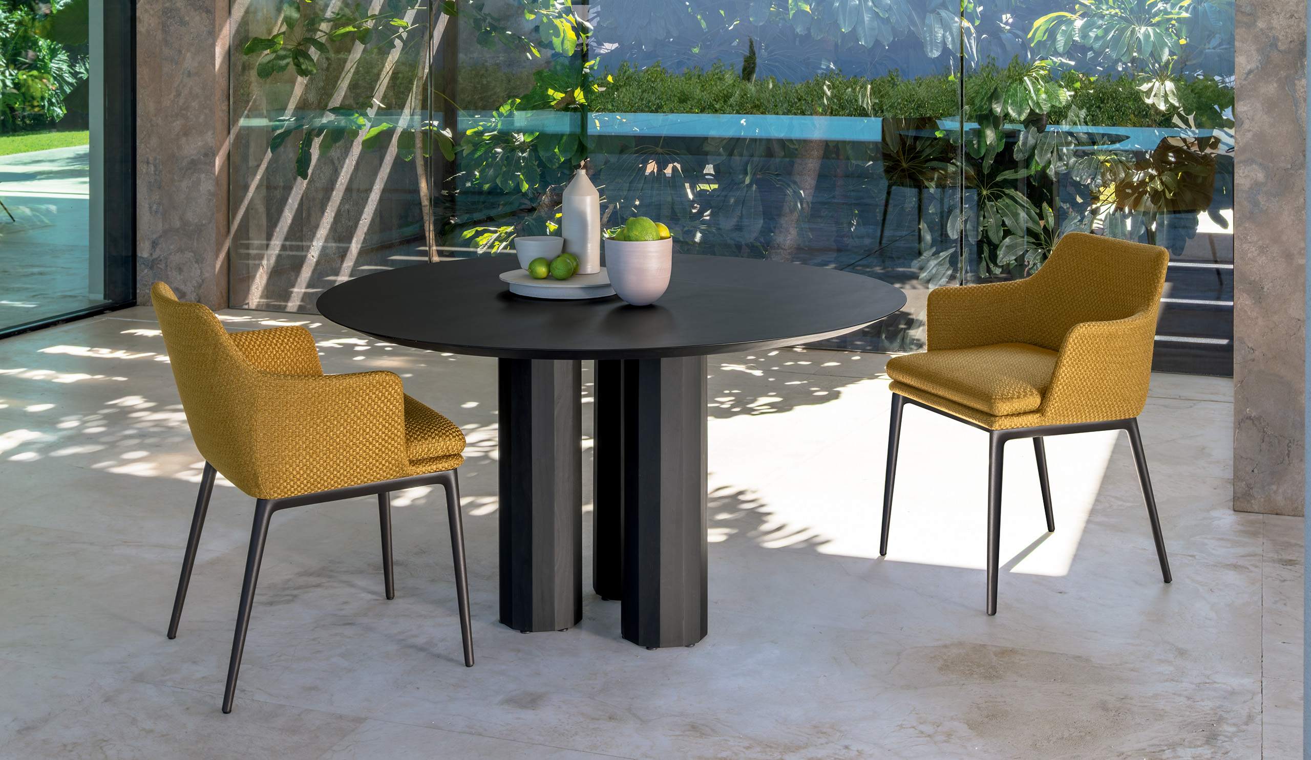 La mesa de comedor Salinas diámetro 135 posee un diseño refinado que aprovecha la materia prima y resalta la textura de la madera. Aporta encanto y elegancia al entorno exterior en el que se integra, evocando la atmósfera de Salinas, región naturalista de Ibiza, de la que se inspira. Las tres columnas centrales que sostienen la mesa evocan el mundo clásico.